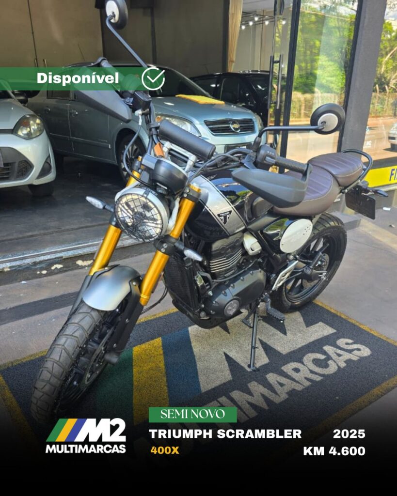 A Triumph Scrambler 400X 2025 chegou por aqui impecável e pronta pra ganhar as ruas com você!